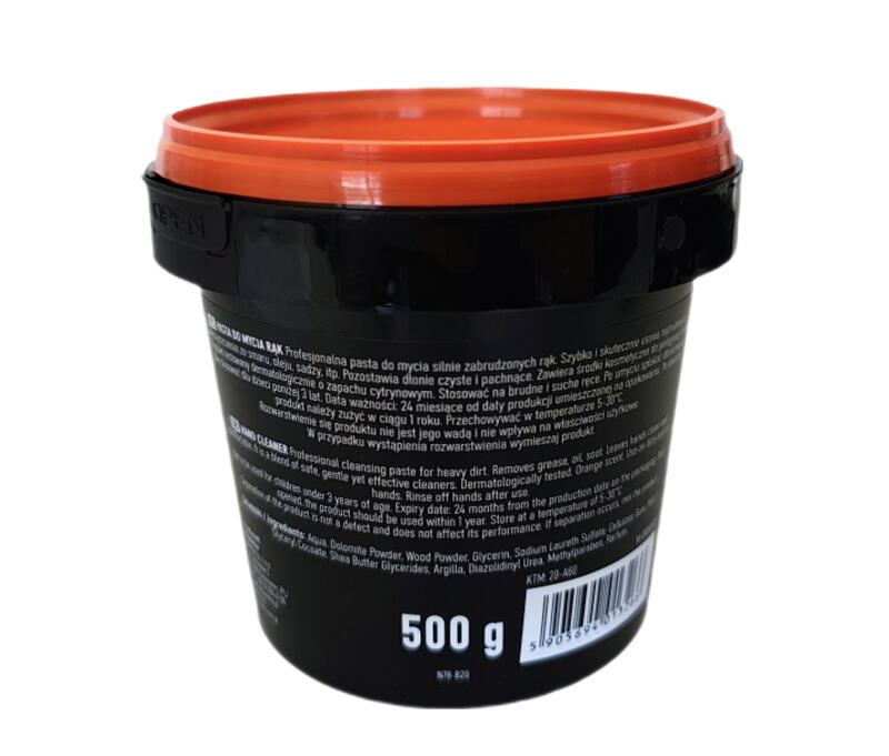 Profesjonalna pasta do mycia silnie zabrudzonych rąk. Szybko i skutecznie usuwa najtrudniejsze zanieczyszczenia ze smaru, oleju, sadzy, smoły itp. Pozostawia dłonie czyste i pachnące. Zawiera środki kosmetyczne do pielęgnacji skóry. Produkt testowany dermatologicznie o zapachu cytrynowym. Stosować na brudne i suche ręce. Po umyciu spłukać dłonie wodą.